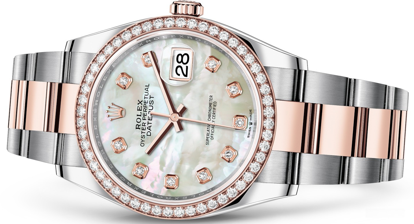 Часы Rolex 126281rbr-0010 изготовлены из нержавеющей стали и розового золота 18к размером 36 х 11 мм. Внутри корпуса установлен автоматический механизм, Калибр 3235 с запасом хода 70 часов. Механизм имеет сертификат швейцарского хронометра, выдаваемый сверхточным часам, успешно прошедшим тестирование в Официальном швейцарском институте хронометрии (COSC). Браслет из розового золота и нержавеющей стали. Циферблат белый жемчужный с 10-ю белыми бриллиантами. Водонепроницаемость до 100 метров. Безель из белых бриллиантов.