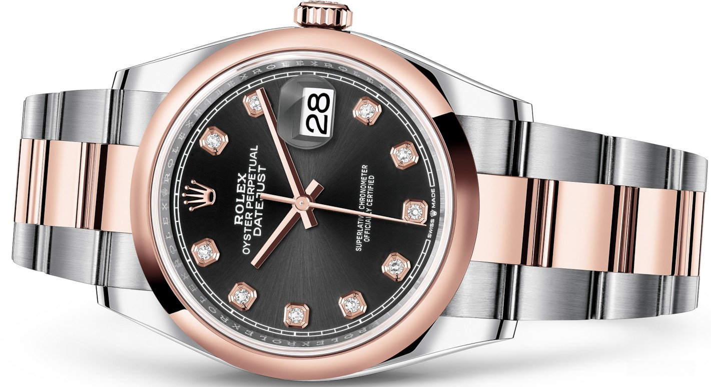 Часы Rolex 126201-0020 изготовлены из нержавеющей стали и розового золота 18к размером 36 х 11 мм. Внутри корпуса установлен автоматический механизм, Калибр 3235 с запасом хода 70 часов. Механизм имеет сертификат швейцарского хронометра, выдаваемый сверхточным часам, успешно прошедшим тестирование в Официальном швейцарском институте хронометрии (COSC). Браслет из розового золота и нержавеющей стали. Циферблат черный с 10-ю белыми бриллиантами. Водонепроницаемость до 100 метров.