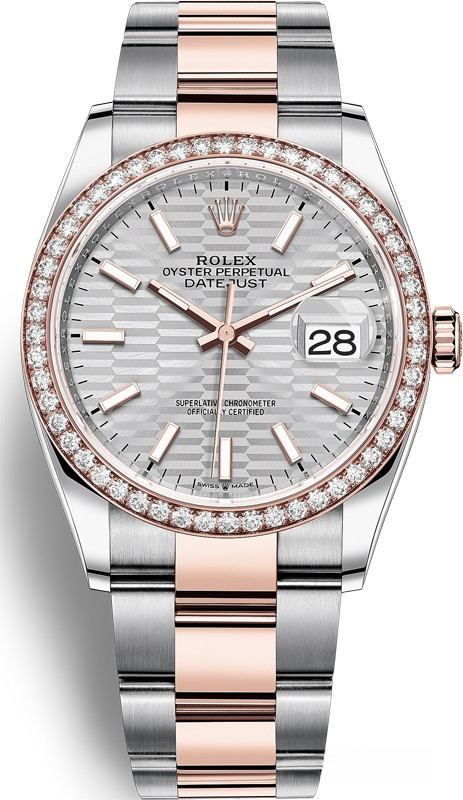 Часы Rolex Datejust 36 mm изготовлены из нержавеющей стали и розового золота 18к размером 36 х 11 мм. Внутри корпуса установлен автоматический механизм, Калибр 3235 с запасом хода 70 часов. Механизм имеет сертификат швейцарского хронометра, выдаваемый сверхточным часам, успешно прошедшим тестирование в Официальном швейцарском институте хронометрии (COSC). Браслет из розового золота и нержавеющей стали. Циферблат серебристый. Водонепроницаемость до 100 метров. Безель из белых бриллиантов.