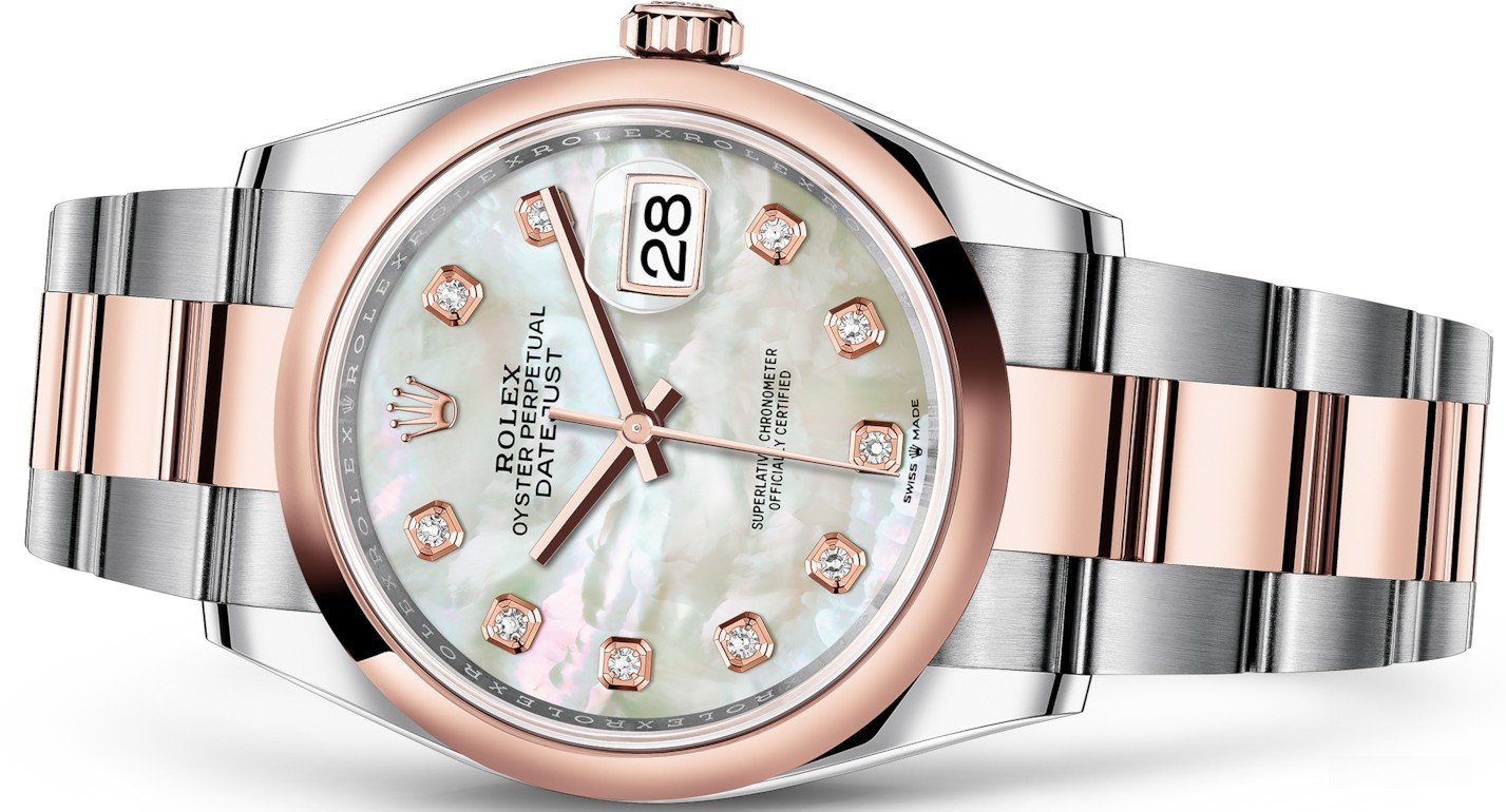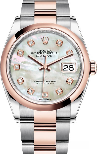 Часы Rolex 126201-0022 изготовлены из нержавеющей стали и розового золота 18к размером 36 х 11 мм. Внутри корпуса установлен автоматический механизм, Калибр 3235 с запасом хода 70 часов. Механизм имеет сертификат швейцарского хронометра, выдаваемый сверхточным часам, успешно прошедшим тестирование в Официальном швейцарском институте хронометрии (COSC). Браслет из розового золота и нержавеющей стали. Циферблат белый жемчужный с 10-ю белыми бриллиантами. Водонепроницаемость до 100 метров.