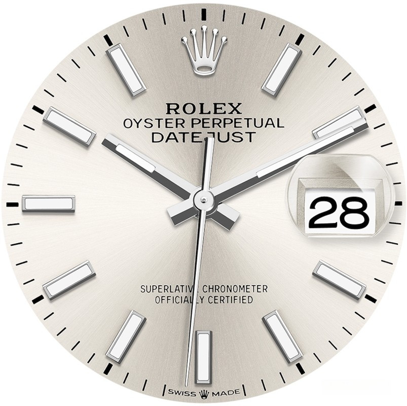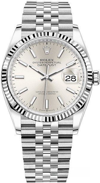 Корпус модели Rolex Datejust 36mm Steel and White Gold выполнен в классическом размере 36 мм из нержавеющей стали 904L, собственного производства компании с безелем из белого золота. На серебристом циферблате отображаются часы, минуты, секунды и дата. Сапфировое стекло с лупой над окошком даты и традиционная водостойкость в 100 метров, благодаря завинчивающейся заводной головки с двумя герметичными прокладкам, одна из которых находится во втулке корпуса, а вторая – внутри заводной головки. В часах установлен механизм, сертифицированный хронометр COSC. Прочный и удобный стальной браслет.