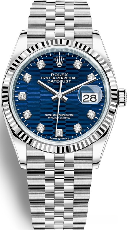Корпус модели Rolex Datejust 36mm Steel and White Gold выполнен в классическом размере 36 мм из нержавеющей стали 904L, собственного производства компании с безелем из белого золота. На синем циферблате с 10-ю белыми бриллиантами отображаются часы, минуты, секунды и дата. Сапфировое стекло с лупой над окошком даты и традиционная водостойкость в 100 метров, благодаря завинчивающейся заводной головки с двумя герметичными прокладкам, одна из которых находится во втулке корпуса, а вторая – внутри заводной головки. В часах установлен механизм, сертифицированный хронометр COSC. Прочный и удобный стальной браслет.