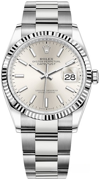 Корпус модели Rolex Datejust 36mm Steel and White Gold выполнен в классическом размере 36 мм из нержавеющей стали 904L, собственного производства компании с безелем из белого золота. На серебристом циферблате отображаются часы, минуты, секунды и дата. Сапфировое стекло с лупой над окошком даты и традиционная водостойкость в 100 метров, благодаря завинчивающейся заводной головки с двумя герметичными прокладкам, одна из которых находится во втулке корпуса, а вторая – внутри заводной головки. В часах установлен механизм, сертифицированный хронометр COSC. Прочный и удобный стальной браслет.