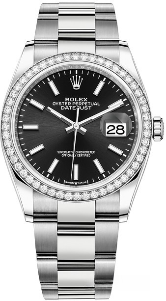 Корпус модели Rolex Datejust 36mm Steel and White Gold выполнен в классическом размере 36 мм из нержавеющей стали 904L, собственного производства компании с безелем из белого золота. На черном циферблате отображаются часы, минуты, секунды и дата. Сапфировое стекло с лупой над окошком даты и традиционная водостойкость в 100 метров, благодаря завинчивающейся заводной головки с двумя герметичными прокладкам, одна из которых находится во втулке корпуса, а вторая – внутри заводной головки. В часах установлен механизм, сертифицированный хронометр COSC. Прочный и удобный стальной браслет. Безель из белых бриллиантов.
