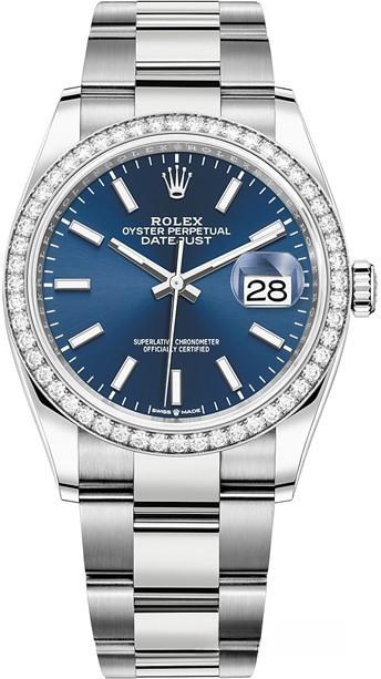 Корпус модели Rolex Datejust 36mm Steel and White Gold выполнен в классическом размере 36 мм из нержавеющей стали 904L, собственного производства компании с безелем из белого золота. На синем циферблате отображаются часы, минуты, секунды и дата. Сапфировое стекло с лупой над окошком даты и традиционная водостойкость в 100 метров, благодаря завинчивающейся заводной головки с двумя герметичными прокладкам, одна из которых находится во втулке корпуса, а вторая – внутри заводной головки. В часах установлен механизм, сертифицированный хронометр COSC. Прочный и удобный стальной браслет. Безель из белых бриллиантов.