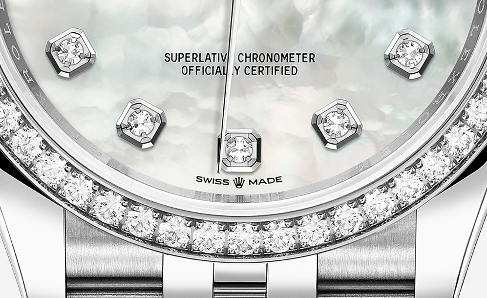 Корпус модели Rolex Datejust 36mm Steel and White Gold выполнен в классическом размере 36 мм из нержавеющей стали 904L, собственного производства компании с безелем из белого золота. На белом жемчужном циферблате с 10-ю белыми бриллиантами отображаются часы, минуты, секунды и дата. Сапфировое стекло с лупой над окошком даты и традиционная водостойкость в 100 метров, благодаря завинчивающейся заводной головки с двумя герметичными прокладкам, одна из которых находится во втулке корпуса, а вторая – внутри заводной головки. В часах установлен механизм, сертифицированный хронометр COSC. Прочный и удобный стальной браслет. Безель из белых бриллиантов.