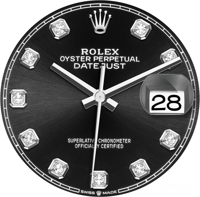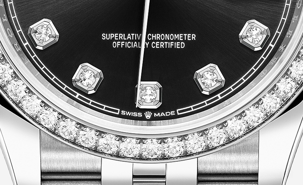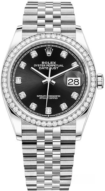 Корпус модели Rolex Datejust 36mm Steel and White Gold выполнен в классическом размере 36 мм из нержавеющей стали 904L, собственного производства компании с безелем из белого золота. На черном циферблате с 10-ю белыми бриллиантами отображаются часы, минуты, секунды и дата. Сапфировое стекло с лупой над окошком даты и традиционная водостойкость в 100 метров, благодаря завинчивающейся заводной головки с двумя герметичными прокладкам, одна из которых находится во втулке корпуса, а вторая – внутри заводной головки. В часах установлен механизм, сертифицированный хронометр COSC. Прочный и удобный стальной браслет. Безель из белых бриллиантов.