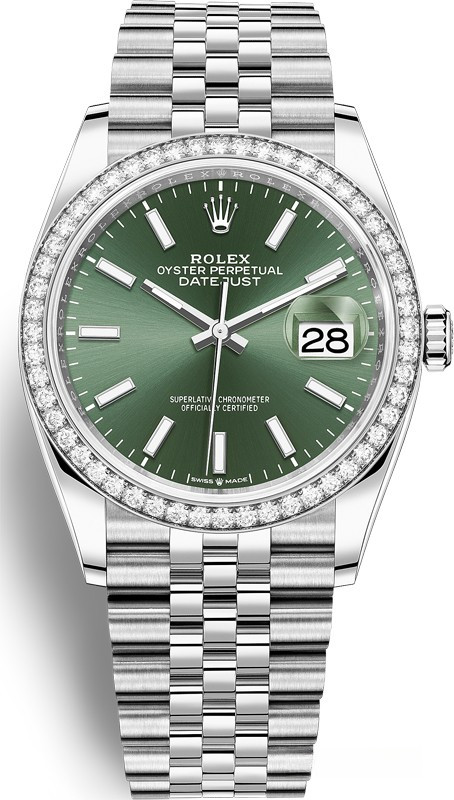 Корпус модели Rolex Datejust 36mm Steel and White Gold выполнен в классическом размере 36 мм из нержавеющей стали 904L, собственного производства компании с безелем из белого золота. На зеленом циферблате отображаются часы, минуты, секунды и дата. Сапфировое стекло с лупой над окошком даты и традиционная водостойкость в 100 метров, благодаря завинчивающейся заводной головки с двумя герметичными прокладкам, одна из которых находится во втулке корпуса, а вторая – внутри заводной головки. В часах установлен механизм, сертифицированный хронометр COSC. Прочный и удобный стальной браслет. Безель из белых бриллиантов.