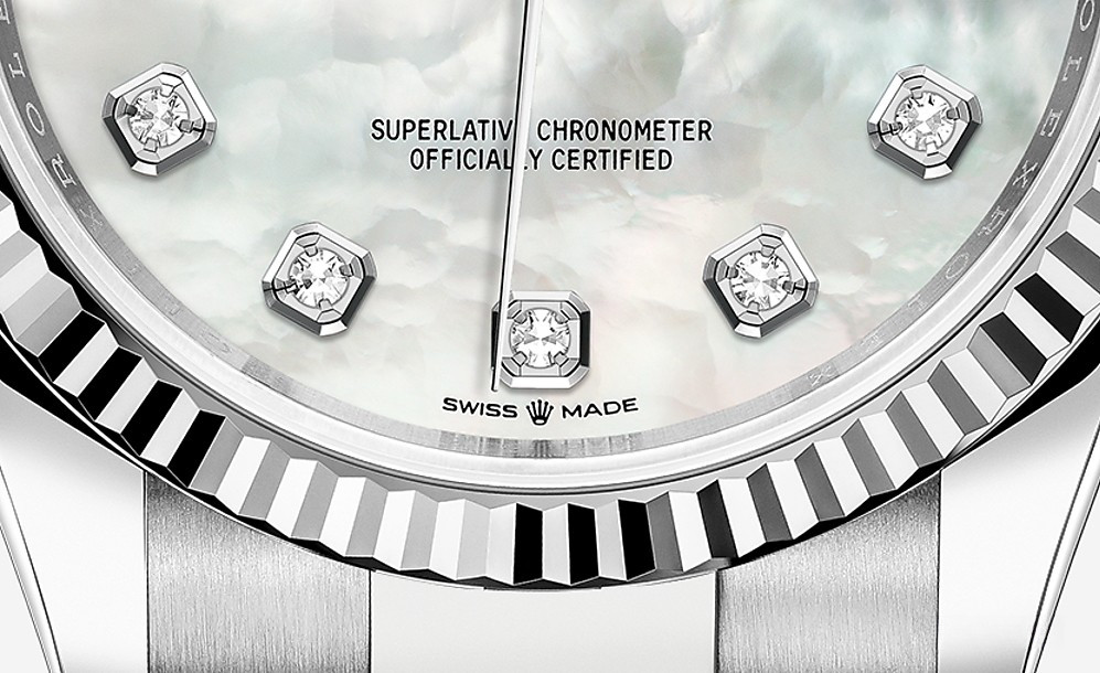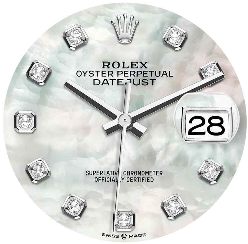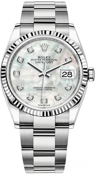 Корпус модели Rolex Datejust 36mm Steel and White Gold выполнен в классическом размере 36 мм из нержавеющей стали 904L, собственного производства компании с безелем из белого золота. На белом жемчужном циферблате с 10-ю белыми бриллиантами отображаются часы, минуты, секунды и дата. Сапфировое стекло с лупой над окошком даты и традиционная водостойкость в 100 метров, благодаря завинчивающейся заводной головки с двумя герметичными прокладкам, одна из которых находится во втулке корпуса, а вторая – внутри заводной головки. В часах установлен механизм, сертифицированный хронометр COSC. Прочный и удобный стальной браслет.