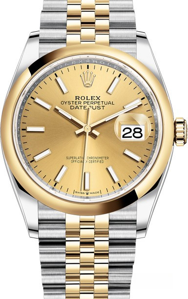 Корпус часов 126203-0015 изготовлен из нержавеющей стали и желтого золота 18к. Размер корпуса 36 мм, водонепроницаемость до 100 м. Циферблат золотистый. На нем отображаются часы, минуты, секунды и дата. Часы комплектуются автоматическим механизмом, Калибр 3235 с запасом хода 70 часов. Поставлется на браслете из нержавеющей стали и желтого золота 18к.
