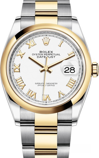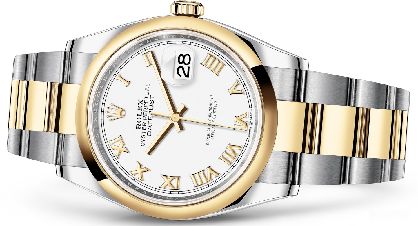 Корпус часов 126203-0030 изготовлен из нержавеющей стали и желтого золота 18к. Размер корпуса 36 мм, водонепроницаемость до 100 м. Циферблат белый. На нем отображаются часы, минуты, секунды и дата. Часы комплектуются автоматическим механизмом, Калибр 3235 с запасом хода 70 часов. Поставлется на браслете из нержавеющей стали и желтого золота 18к.