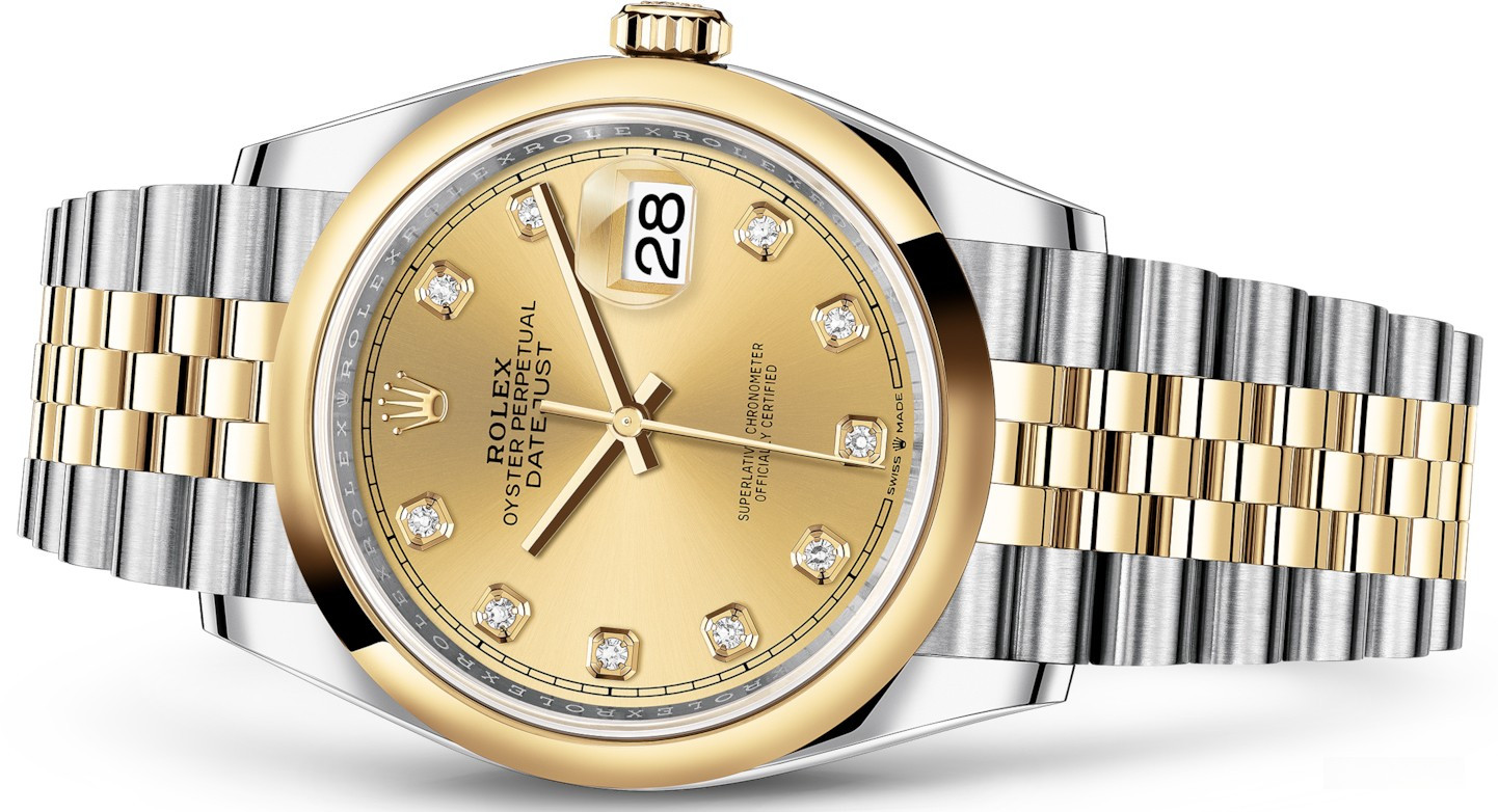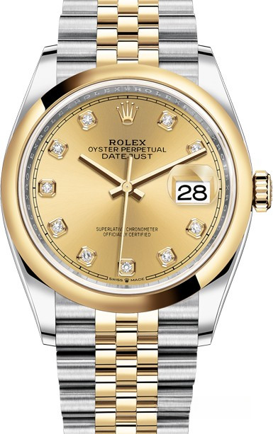 Корпус часов 126203-0017 изготовлен из нержавеющей стали и желтого золота 18к. Размер корпуса 36 мм, водонепроницаемость до 100 м. Циферблат золотистый с 10-ю белыми бриллиантами. На нем отображаются часы, минуты, секунды и дата. Часы комплектуются автоматическим механизмом, Калибр 3235 с запасом хода 70 часов. Поставлется на браслете из нержавеющей стали и желтого золота 18к.