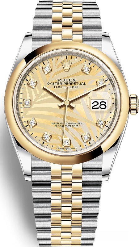 Корпус часов изготовлен из нержавеющей стали и желтого золота 18к. Размер корпуса 36 мм, водонепроницаемость до 100 м. Циферблат золотистый с 10-ю белыми бриллиантами. На нем отображаются часы, минуты, секунды и дата. Часы комплектуются автоматическим механизмом, Калибр 3235 с запасом хода 70 часов. Поставлется на браслете из нержавеющей стали и желтого золота 18к.