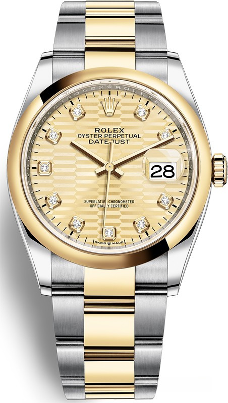 Корпус часов изготовлен из нержавеющей стали и желтого золота 18к. Размер корпуса 36 мм, водонепроницаемость до 100 м. Циферблат золотистый с 10-ю белыми бриллиантами. На нем отображаются часы, минуты, секунды и дата. Часы комплектуются автоматическим механизмом, Калибр 3235 с запасом хода 70 часов. Поставлется на браслете из нержавеющей стали и желтого золота 18к.