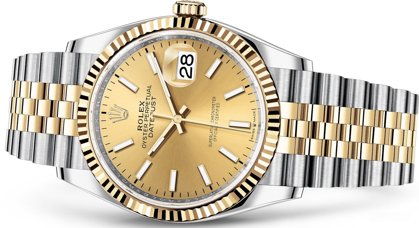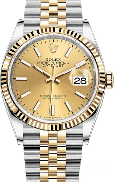 Корпус часов 126233-0015 изготовлен из нержавеющей стали и желтого золота 18к. Размер корпуса 36 мм, водонепроницаемость до 100 м. Циферблат золотистый. На нем отображаются часы, минуты, секунды и дата. Часы комплектуются автоматическим механизмом, Калибр 3235 с запасом хода 70 часов. Поставлется на браслете из нержавеющей стали и желтого золота 18к.