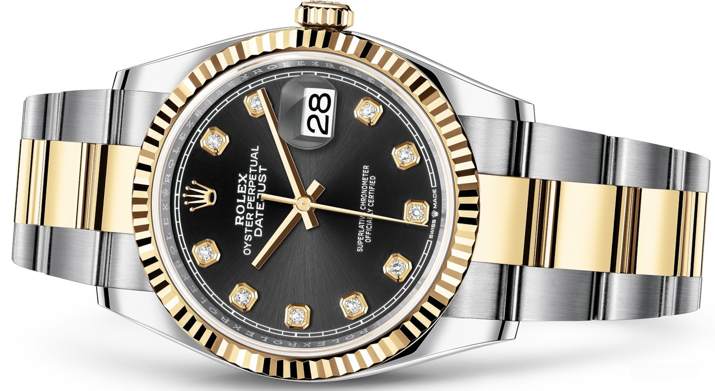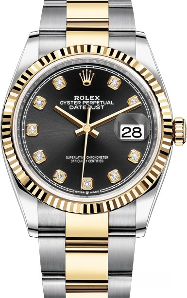 Корпус часов 126233-0022 изготовлен из нержавеющей стали и желтого золота 18к. Размер корпуса 36 мм, водонепроницаемость до 100 м. Циферблат черный с 10-ю белыми бриллиантами. На нем отображаются часы, минуты, секунды и дата. Часы комплектуются автоматическим механизмом, Калибр 3235 с запасом хода 70 часов. Поставлется на браслете из нержавеющей стали и желтого золота 18к.