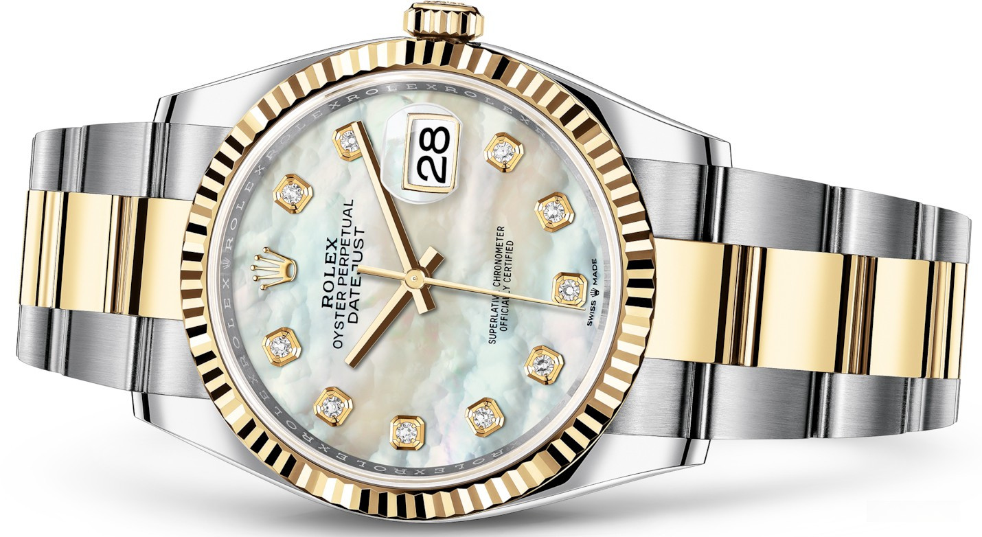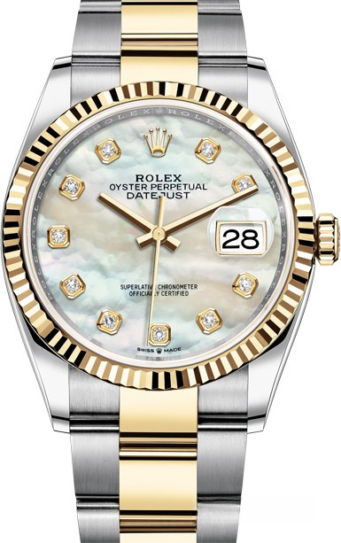 Корпус часов 126233-0024 изготовлен из нержавеющей стали и желтого золота 18к. Размер корпуса 36 мм, водонепроницаемость до 100 м. Циферблат белый жемчужный с 10-ю белыми бриллиантами. На нем отображаются часы, минуты, секунды и дата. Часы комплектуются автоматическим механизмом, Калибр 3235 с запасом хода 70 часов. Поставлется на браслете из нержавеющей стали и желтого золота 18к.