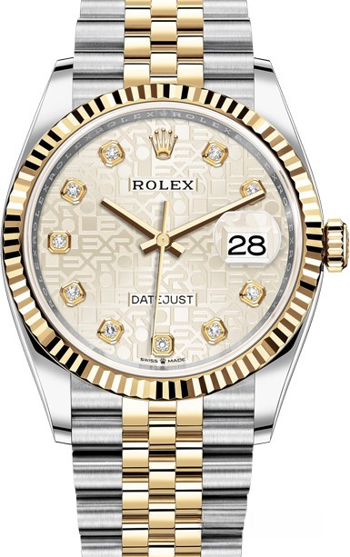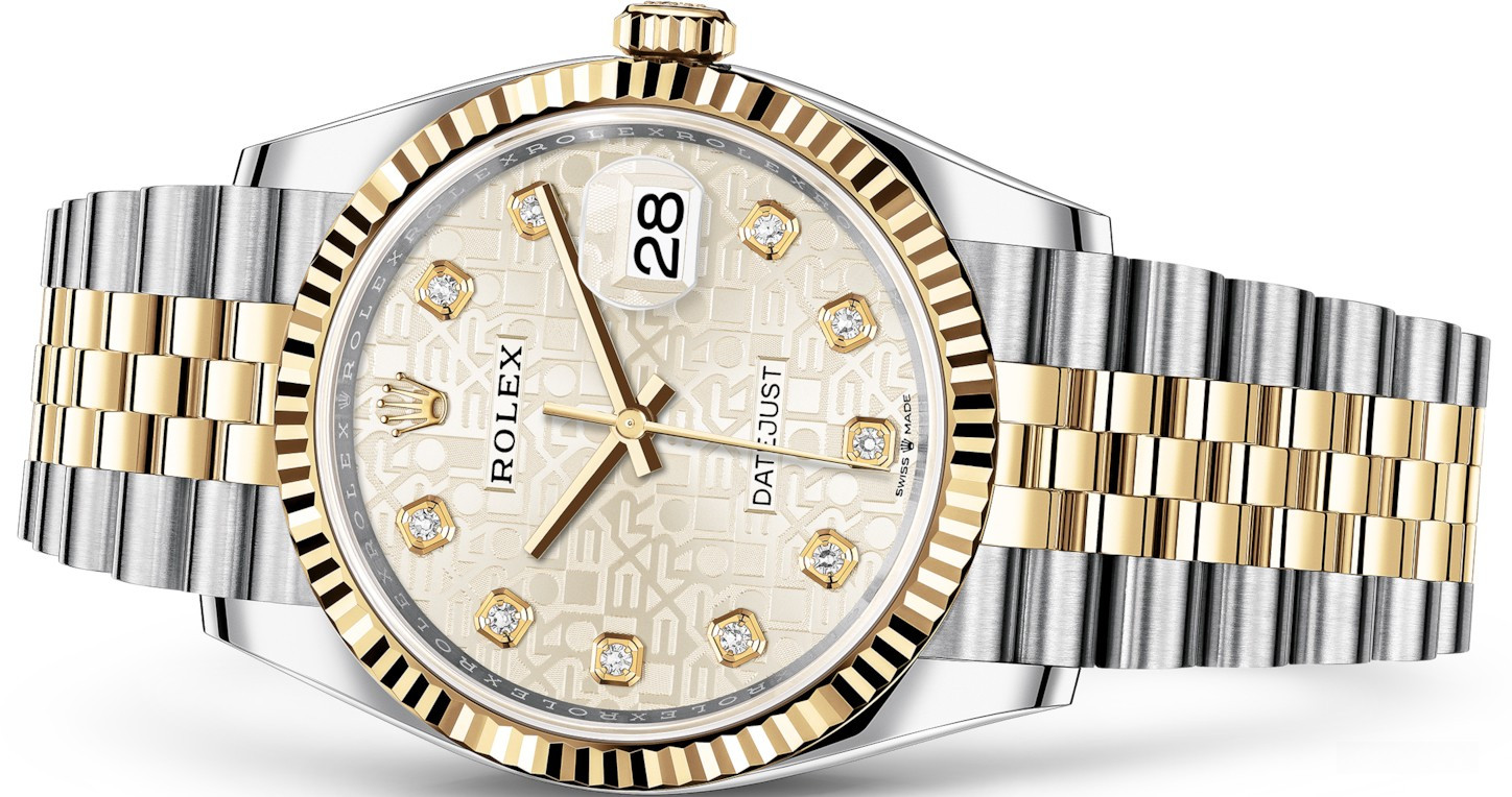 Корпус часов 126233-0027 изготовлен из нержавеющей стали и желтого золота 18к. Размер корпуса 36 мм, водонепроницаемость до 100 м. Циферблат серебристый гильошированный с 10-ю белыми бриллиантами. На нем отображаются часы, минуты, секунды и дата. Часы комплектуются автоматическим механизмом, Калибр 3235 с запасом хода 70 часов. Поставлется на браслете из нержавеющей стали и желтого золота 18к.