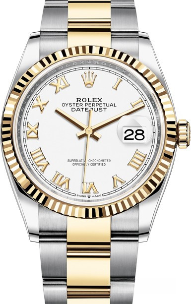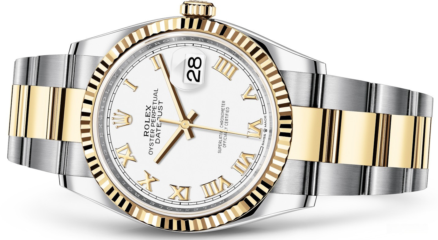 Корпус часов 126233-0030 изготовлен из нержавеющей стали и желтого золота 18к. Размер корпуса 36 мм, водонепроницаемость до 100 м. Циферблат белый. На нем отображаются часы, минуты, секунды и дата. Часы комплектуются автоматическим механизмом, Калибр 3235 с запасом хода 70 часов. Поставлется на браслете из нержавеющей стали и желтого золота 18к.
