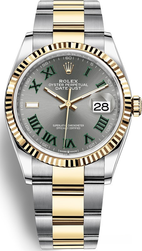 Корпус часов изготовлен из нержавеющей стали и желтого золота 18к. Размер корпуса 36 мм, водонепроницаемость до 100 м. Циферблат серый. На нем отображаются часы, минуты, секунды и дата. Часы комплектуются автоматическим механизмом, Калибр 3235 с запасом хода 70 часов. Поставлется на браслете из нержавеющей стали и желтого золота 18к.
