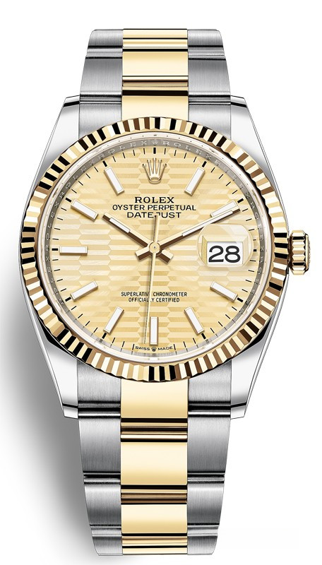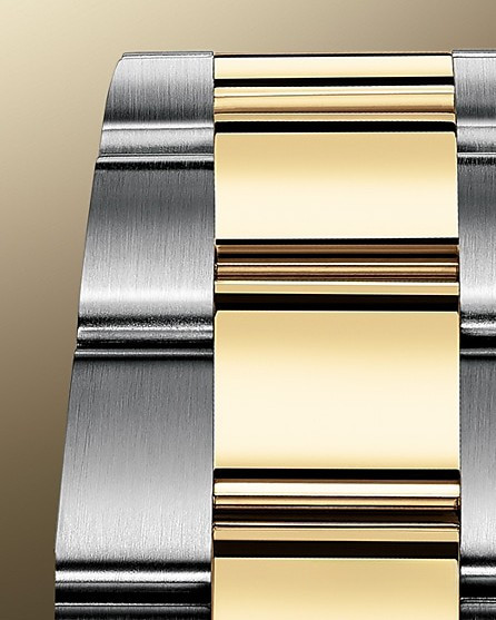 Корпус часов изготовлен из нержавеющей стали и желтого золота 18к. Размер корпуса 36 мм, водонепроницаемость до 100 м. Циферблат золотистый. На нем отображаются часы, минуты, секунды и дата. Часы комплектуются автоматическим механизмом, Калибр 3235 с запасом хода 70 часов. Поставлется на браслете из нержавеющей стали и желтого золота 18к.