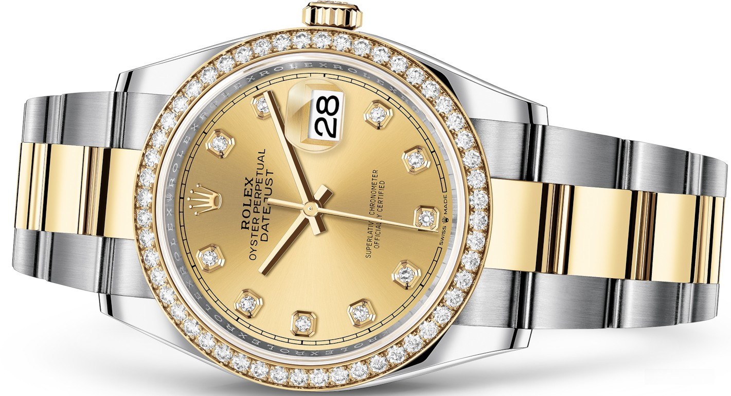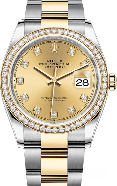 Корпус часов 126283rbr-0004 изготовлен из нержавеющей стали и желтого золота 18к. Размер корпуса 36 мм, водонепроницаемость до 100 м. Циферблат золотистый с 10-ю белыми бриллиантами. На нем отображаются часы, минуты, секунды и дата. Часы комплектуются автоматическим механизмом, Калибр 3235 с запасом хода 70 часов. Поставлется на браслете из нержавеющей стали и желтого золота 18к. Безель из белых бриллиантов.