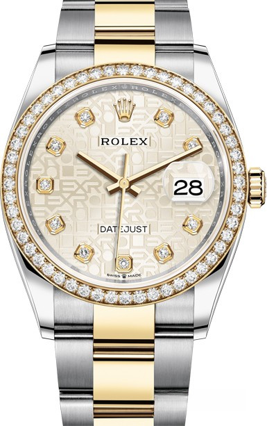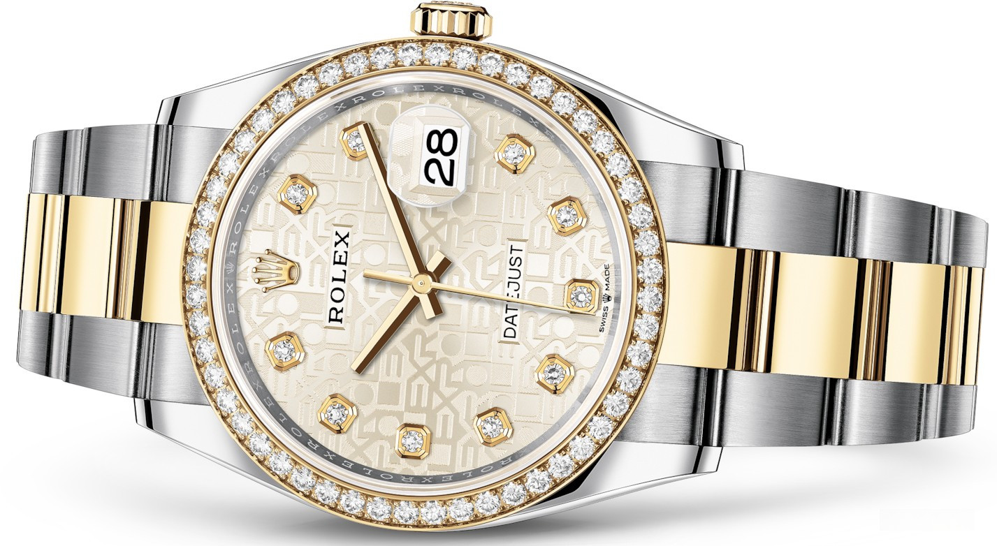 Корпус часов 126283rbr-0014 изготовлен из нержавеющей стали и желтого золота 18к. Размер корпуса 36 мм, водонепроницаемость до 100 м. Циферблат серебристый гильошированный с 10-ю белыми бриллиантами. На нем отображаются часы, минуты, секунды и дата. Часы комплектуются автоматическим механизмом, Калибр 3235 с запасом хода 70 часов. Поставлется на браслете из нержавеющей стали и желтого золота 18к. Безель из белых бриллиантов.
