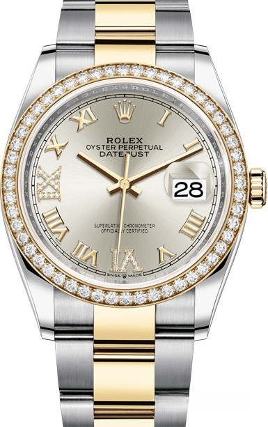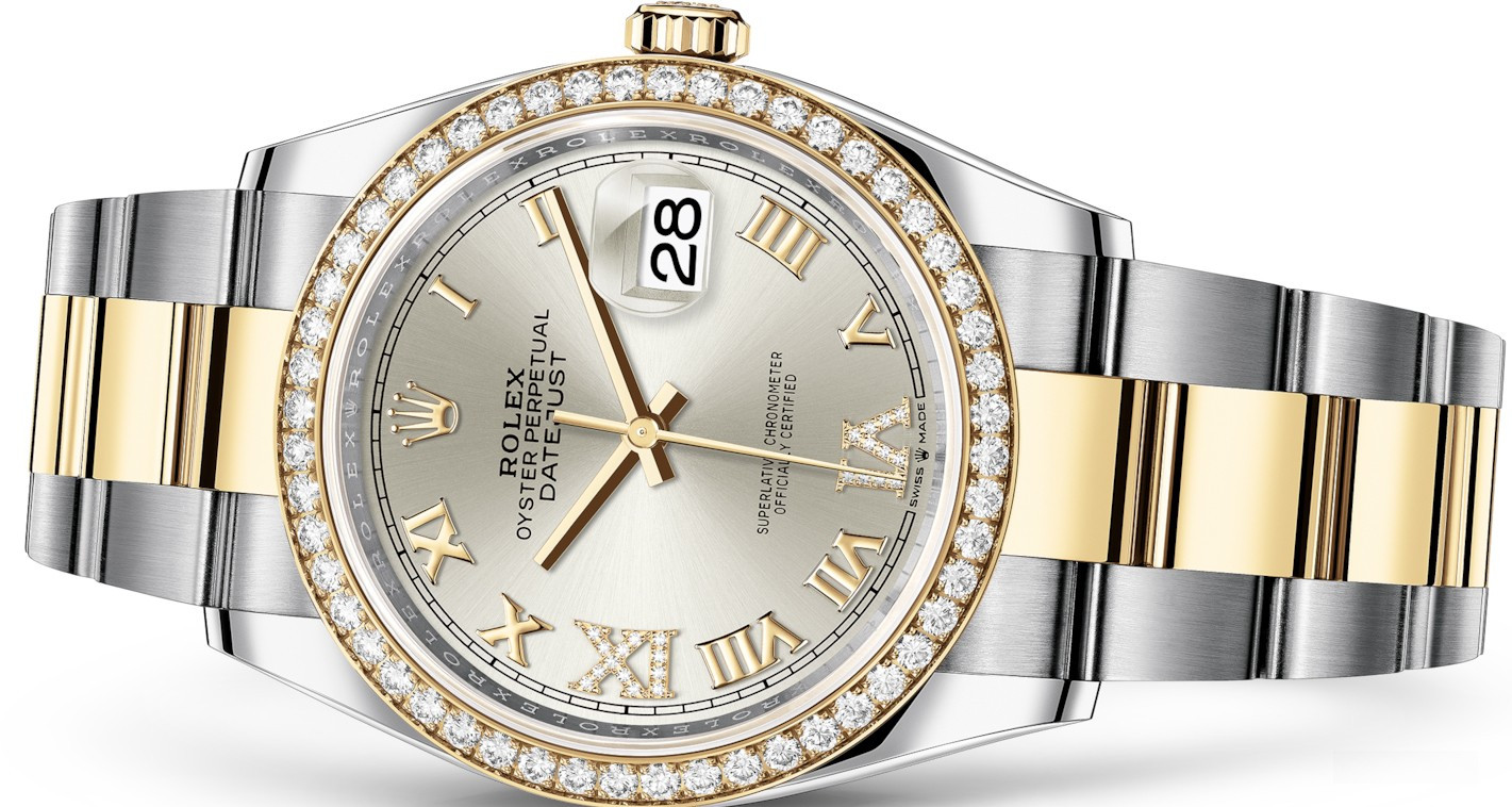 Корпус часов 126283rbr-0018 изготовлен из нержавеющей стали и желтого золота 18к. Размер корпуса 36 мм, водонепроницаемость до 100 м. Циферблат серебристый с белыми бриллиантами. На нем отображаются часы, минуты, секунды и дата. Часы комплектуются автоматическим механизмом, Калибр 3235 с запасом хода 70 часов. Поставлется на браслете из нержавеющей стали и желтого золота 18к. Безель из белых бриллиантов.