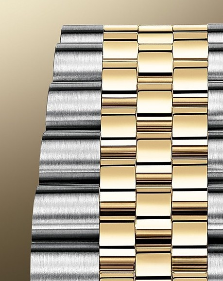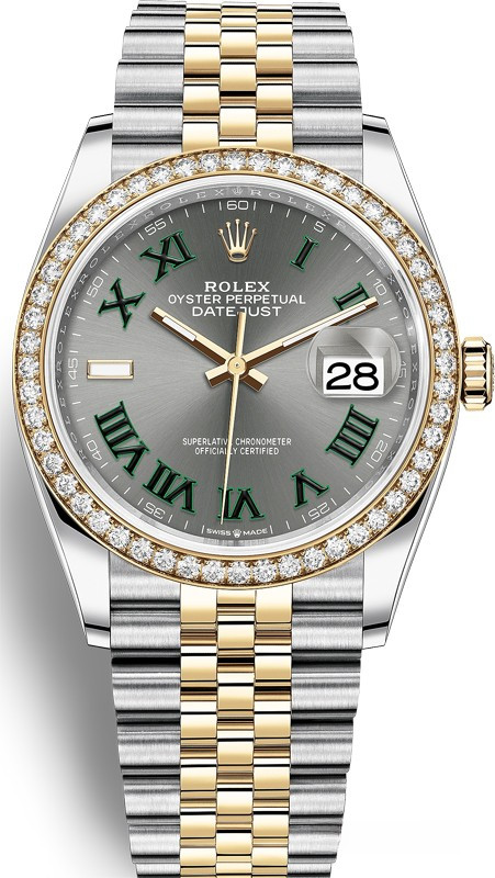Корпус часов изготовлен из нержавеющей стали и желтого золота 18к. Размер корпуса 36 мм, водонепроницаемость до 100 м. Циферблат серый. На нем отображаются часы, минуты, секунды и дата. Часы комплектуются автоматическим механизмом, Калибр 3235 с запасом хода 70 часов. Поставлется на браслете из нержавеющей стали и желтого золота 18к. Безель из белых бриллиантов.