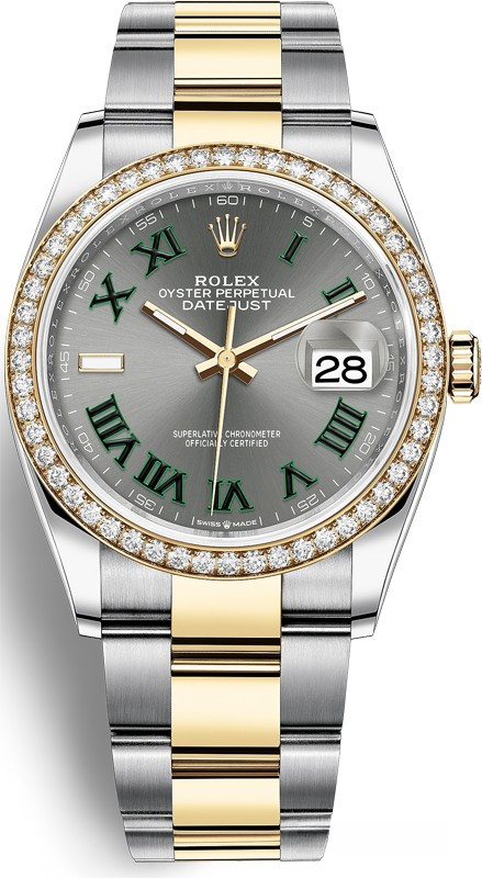 Корпус часов изготовлен из нержавеющей стали и желтого золота 18к. Размер корпуса 36 мм, водонепроницаемость до 100 м. Циферблат серый. На нем отображаются часы, минуты, секунды и дата. Часы комплектуются автоматическим механизмом, Калибр 3235 с запасом хода 70 часов. Поставлется на браслете из нержавеющей стали и желтого золота 18к. Безель из белых бриллиантов.