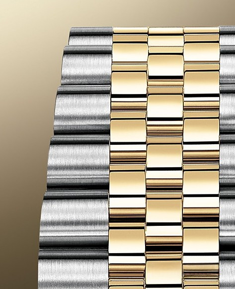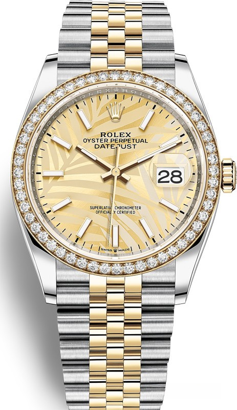 Корпус часов изготовлен из нержавеющей стали и желтого золота 18к. Размер корпуса 36 мм, водонепроницаемость до 100 м. Циферблат золотистый. На нем отображаются часы, минуты, секунды и дата. Часы комплектуются автоматическим механизмом, Калибр 3235 с запасом хода 70 часов. Поставлется на браслете из нержавеющей стали и желтого золота 18к. Безель из белых бриллиантов.