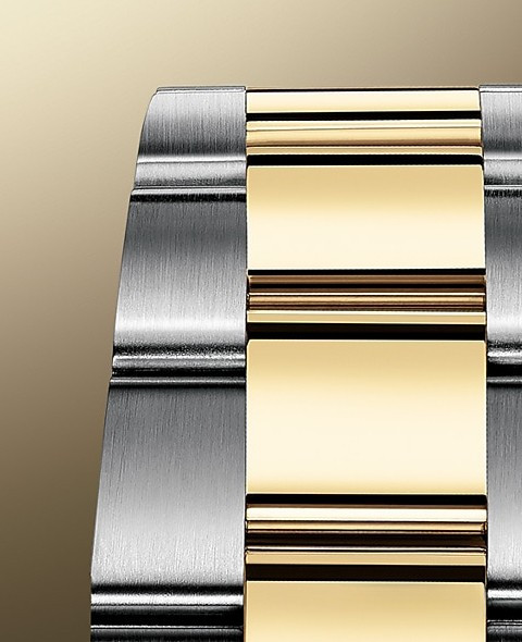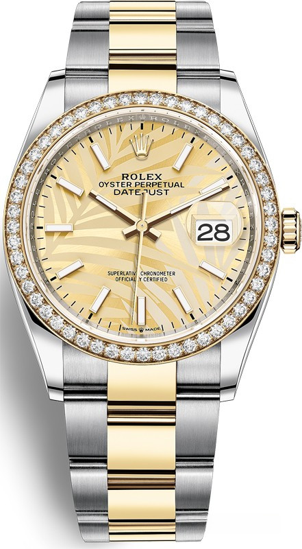 Корпус часов изготовлен из нержавеющей стали и желтого золота 18к. Размер корпуса 36 мм, водонепроницаемость до 100 м. Циферблат золотистый. На нем отображаются часы, минуты, секунды и дата. Часы комплектуются автоматическим механизмом, Калибр 3235 с запасом хода 70 часов. Поставлется на браслете из нержавеющей стали и желтого золота 18к. Безель из белых бриллиантов.