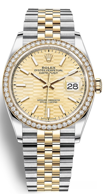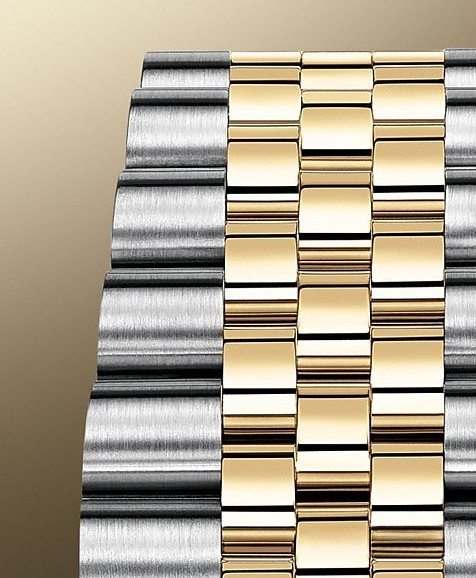 Корпус часов изготовлен из нержавеющей стали и желтого золота 18к. Размер корпуса 36 мм, водонепроницаемость до 100 м. Циферблат золотистый. На нем отображаются часы, минуты, секунды и дата. Часы комплектуются автоматическим механизмом, Калибр 3235 с запасом хода 70 часов. Поставлется на браслете из нержавеющей стали и желтого золота 18к. Безель из белых бриллиантов.
