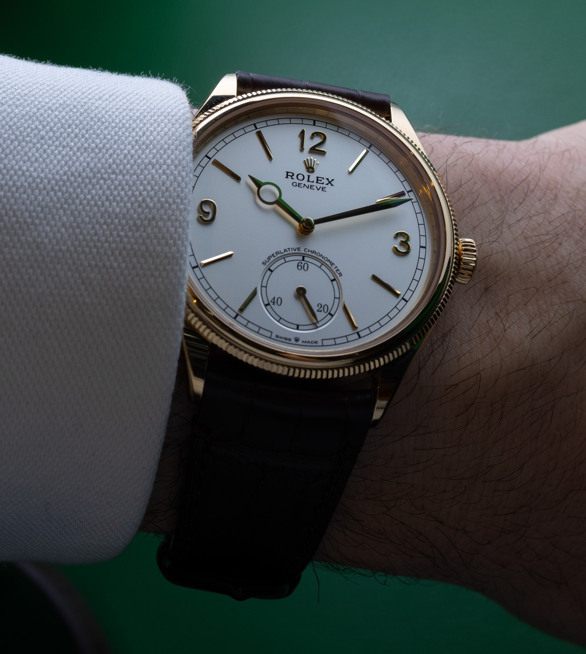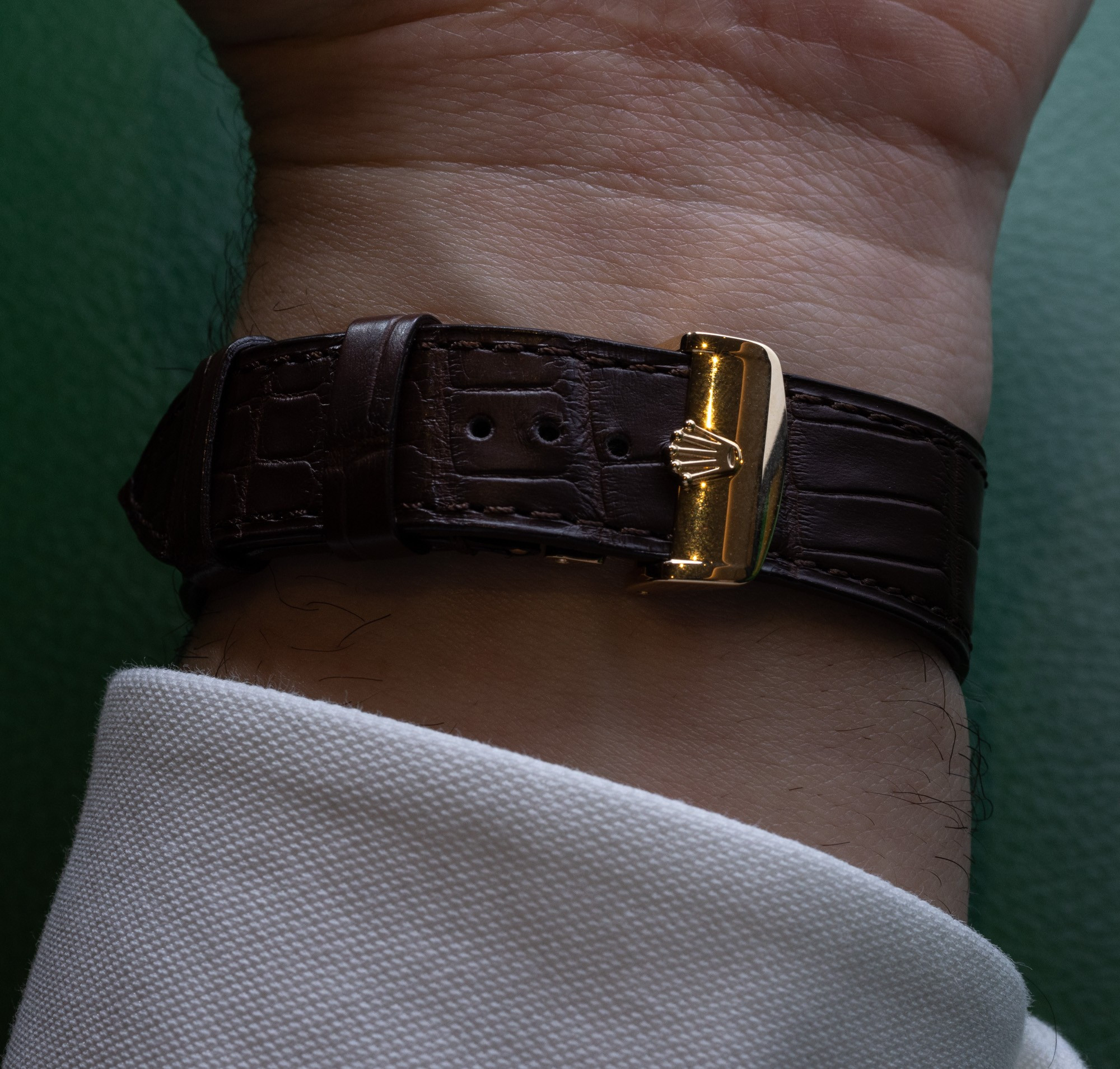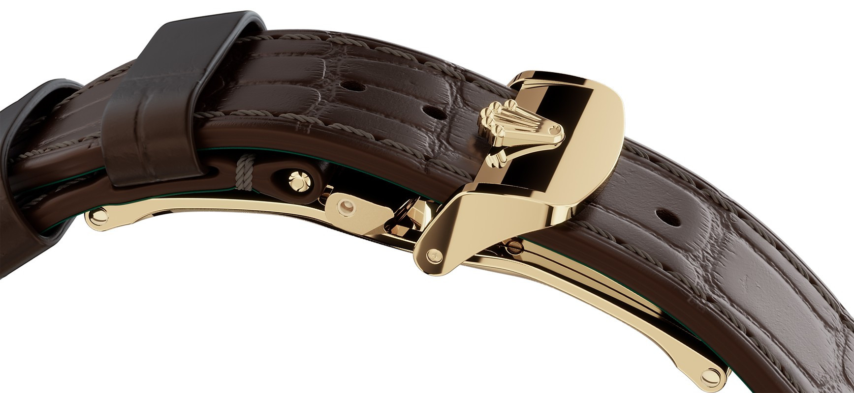 Часы Rolex 1908 39 mm представлены в корпусе диаметром 39 мм из желтого золота 18к водонепроницаемостью 50 метров. Внутри корпуса установлен автоматический механизм, Калибр 7140, обладающий запасом хода 66 часов. На белом циферблате отображаются часы, минуты, секунды. Часы оставляются с ремешком из кожи аллигатора с золотой застежкой.