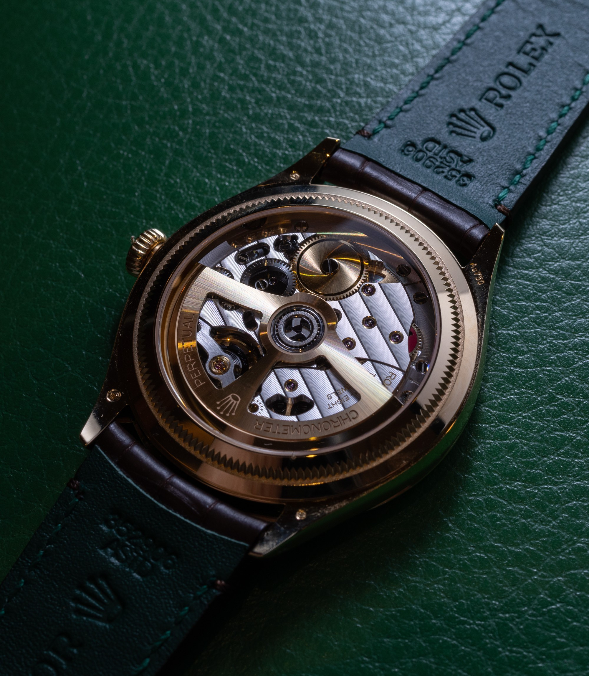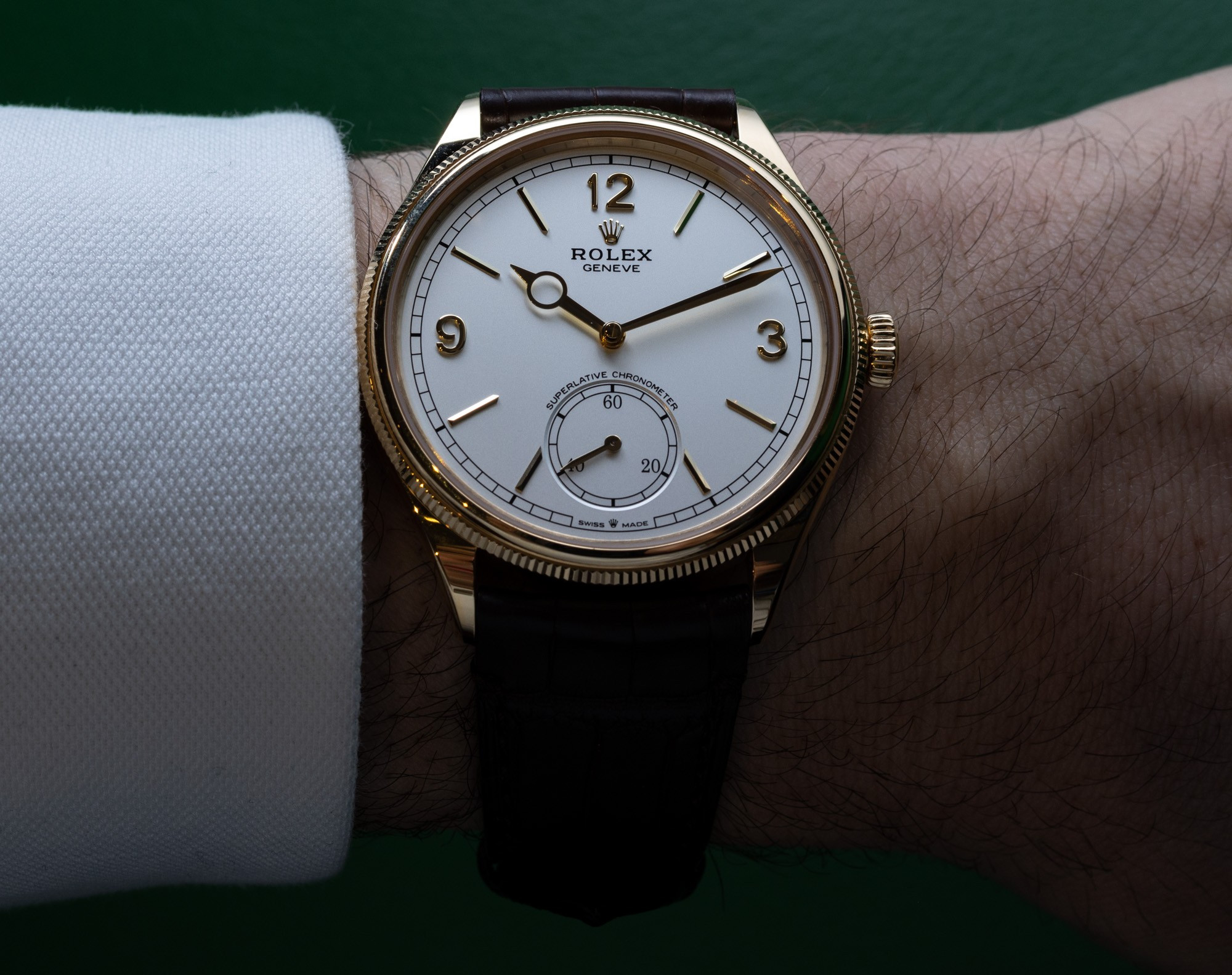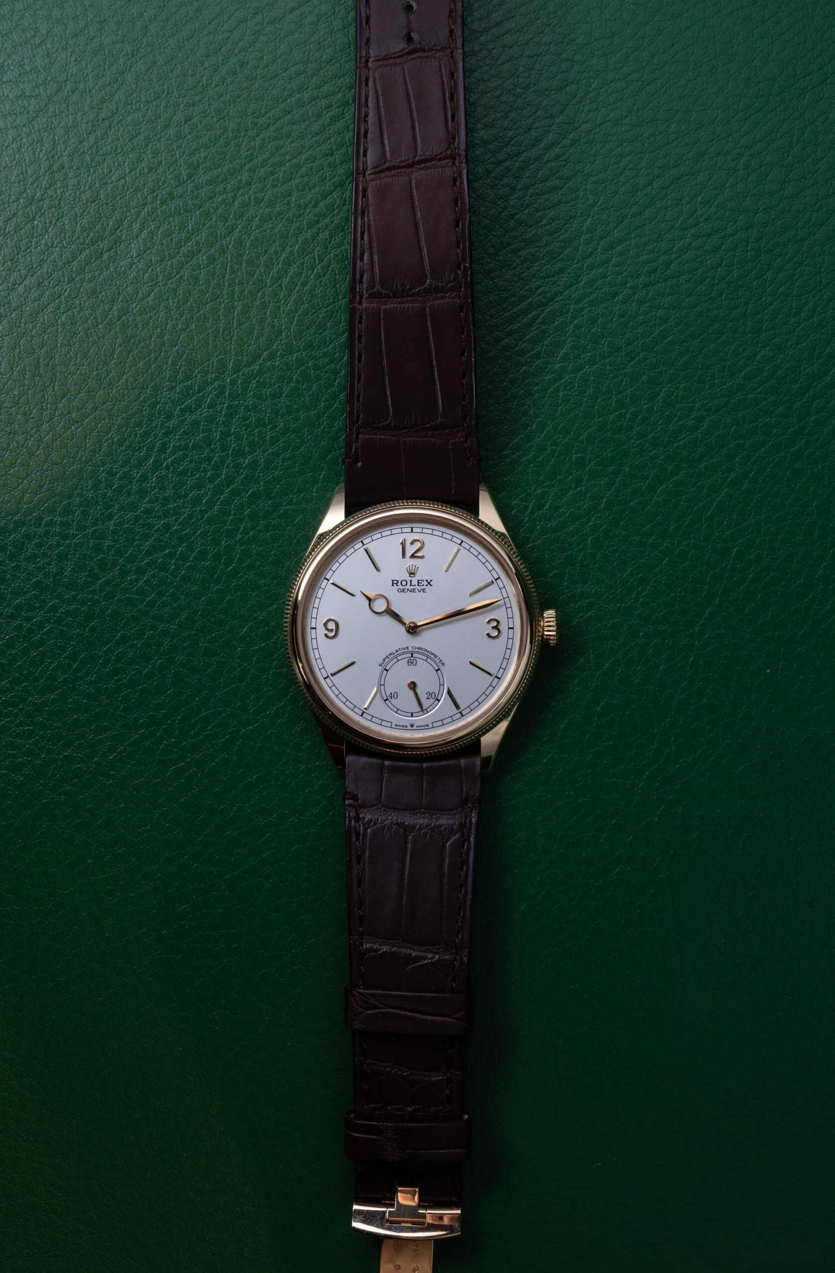 Часы Rolex 1908 39 mm представлены в корпусе диаметром 39 мм из желтого золота 18к водонепроницаемостью 50 метров. Внутри корпуса установлен автоматический механизм, Калибр 7140, обладающий запасом хода 66 часов. На белом циферблате отображаются часы, минуты, секунды. Часы оставляются с ремешком из кожи аллигатора с золотой застежкой.
