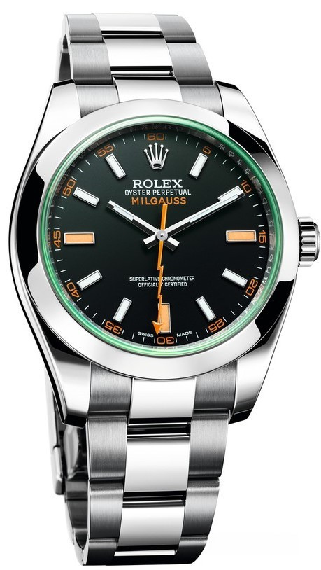 Водостойкие часы Rolex Milgauss Milgauss 40mm Steel 116400GV являются официально сертифицированным хронометром COSC выпущены в круглом корпусе из нержавеющей стали. Размер составляет 40 х 14 мм, водонепроницаемость 100 м с корпусом защиты от магнитного поля до 1000 гауссов с зеленым сапфировым стеклом. Внутри корпуса установлен автоматический механизм, Калибр 3131, обеспечивающий запас хода 42 часа. На черном циферблате отображаются часы, минуты, секунды. Часы комплектуются браслетом из нержавеющей стали.