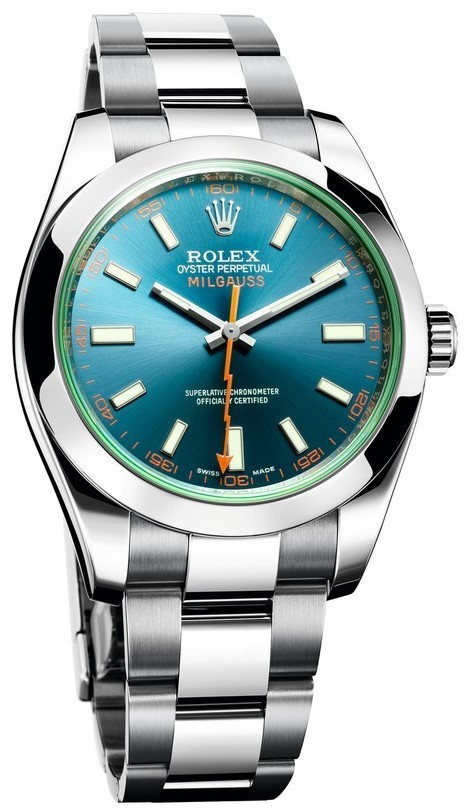 Ролекс представляет новый вариант часов Oyster Perpetual Milgauss, наделенных как уникальной, так и символической эстетикой. Эти часы сочетают сапфировое стекло зеленого цвета, впервые в истории часового дела примененное на модели Milgauss в 2007 году, и новый циферблат насыщенного синего цвета, напоминание об их легендарной минутной стрелке в виде молнии и о техническом назначении защищенных от воздействия магнитных полей часов, созданных для инженеров и ученых в 50-е годы, золотые годы научных исследований. Просвечиваясь через стекло из зеленого сапфира, этот циферблат цвета «синий Z», выглядит как магнит, который имеет сильную эстетическую привлекательность. Модель Milgauss с самого начала является авангардными часами. Она была создана в 1956 году для инженеров и техников, столкнувшихся с эффектом воздействия магнитного поля на нормальный ход механических часов, и смогла противостоять магнитным полям высокой напряженности до 1000 Гауссов, откуда и название модели. Вместе с тем, часы сохранили все качества и точность официально сертифицированного хронографа. Первые в своем роде, они появились на запястье ученых Европейского центра ядерных исследований (CERN), в Женеве, приобретя в связи с этим статус часов науки и технического прогресса. Несколько инноваций содействуют защите от магнетизма. Первая линия защиты – экран из ферромагнитных сплавов, расположенный внутри корпуса Oyster вокруг механизма, – изобретение, запатентованное Ролексом в 1954 году. Вторая линия защиты проходит непосредственно через часовой механизм, осциллятор и ходовую часть, сделанные из парамагнитных материалов нового поколения, которые разработал Ролекс с начала 2000 годов.