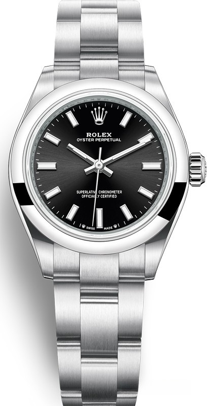 Часы Rolex Oyster Perpetual являются официально сертифицированным хронометром COSC, выпущены в круглом корпусе из нержавеющей стали. Размер составляет 28 мм, водонепроницаемость 100 м. Внутри корпуса установлен автоматический механизм, Калибр 2232, обладающий запасом хода 55 часов. На черном циферблате отображаются часы, минуты, секунды. Часы комплектуются браслетом из нержавеющей стали.