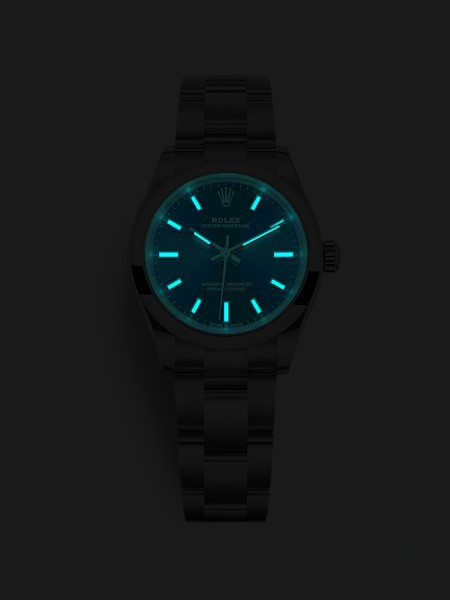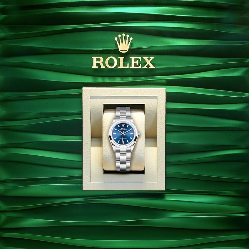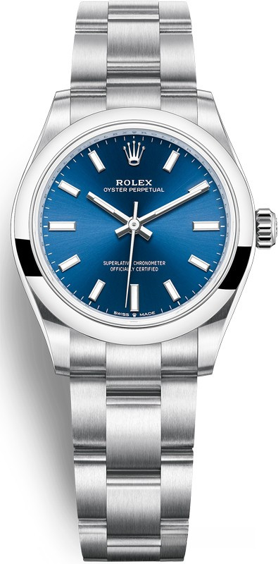 Часы Rolex Oyster Perpetual являются официально сертифицированным хронометром COSC, выпущены в круглом корпусе из нержавеющей стали. Размер составляет 31 мм, водонепроницаемость 100 м. Внутри корпуса установлен автоматический механизм, Калибр 2232, обладающий запасом хода 55 часов. На синем циферблате отображаются часы, минуты, секунды. Часы комплектуются браслетом из нержавеющей стали.