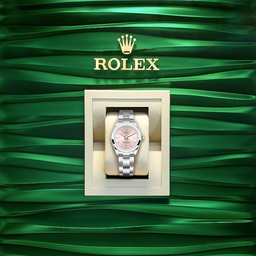 Часы Rolex Oyster Perpetual являются официально сертифицированным хронометром COSC, выпущены в круглом корпусе из нержавеющей стали. Размер составляет 31 мм, водонепроницаемость 100 м. Внутри корпуса установлен автоматический механизм, Калибр 2232, обладающий запасом хода 55 часов. На розовом циферблате отображаются часы, минуты, секунды. Часы комплектуются браслетом из нержавеющей стали.