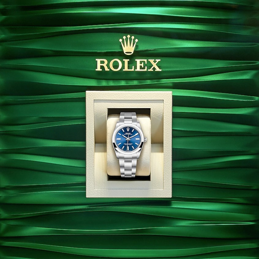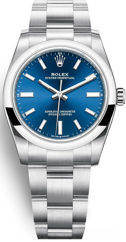 Часы Rolex Oyster Perpetual являются официально сертифицированным хронометром COSC, выпущены в круглом корпусе из нержавеющей стали. Размер составляет 34 мм, водонепроницаемость 100 м. Внутри корпуса установлен автоматический механизм, Калибр 2232, обладающий запасом хода 55 часов. На синем циферблате отображаются часы, минуты, секунды. Часы комплектуются браслетом из нержавеющей стали.