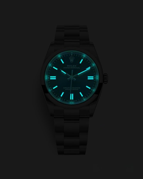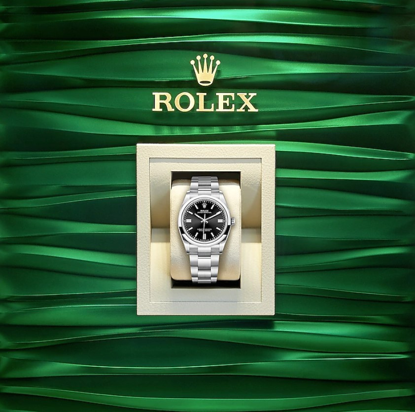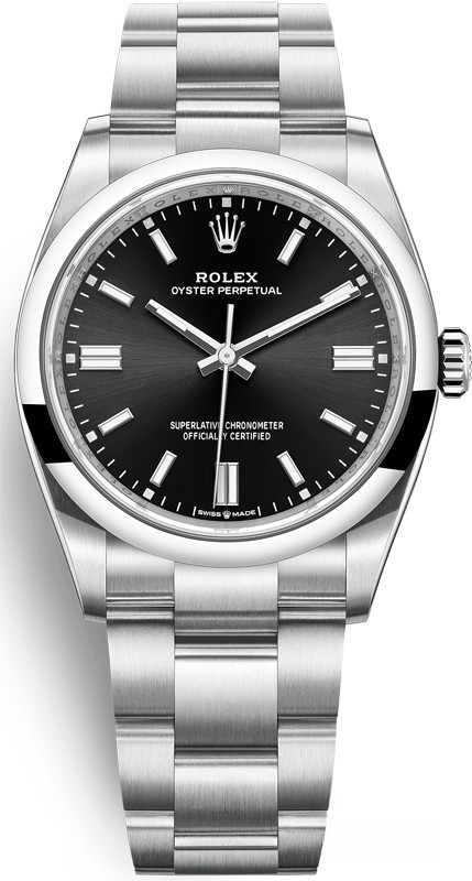 Часы Rolex Oyster Perpetual являются официально сертифицированным хронометром COSC, выпущены в круглом корпусе из нержавеющей стали. Размер составляет 36 мм, водонепроницаемость 100 м. Внутри корпуса установлен автоматический механизм, Калибр 3230, обладающий запасом хода 70 часов. На черном циферблате отображаются часы, минуты, секунды. Часы комплектуются браслетом из нержавеющей стали.