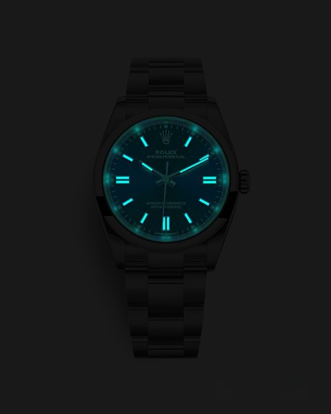 Часы Rolex Oyster Perpetual являются официально сертифицированным хронометром COSC, выпущены в круглом корпусе из нержавеющей стали. Размер составляет 36 мм, водонепроницаемость 100 м. Внутри корпуса установлен автоматический механизм, Калибр 3230, обладающий запасом хода 70 часов. На синем циферблате отображаются часы, минуты, секунды. Часы комплектуются браслетом из нержавеющей стали.