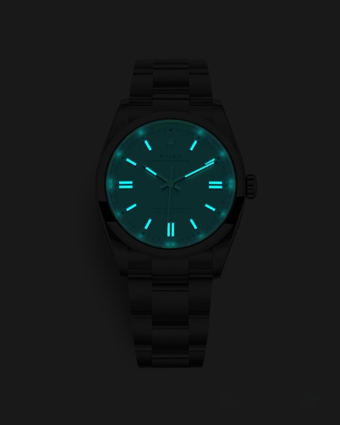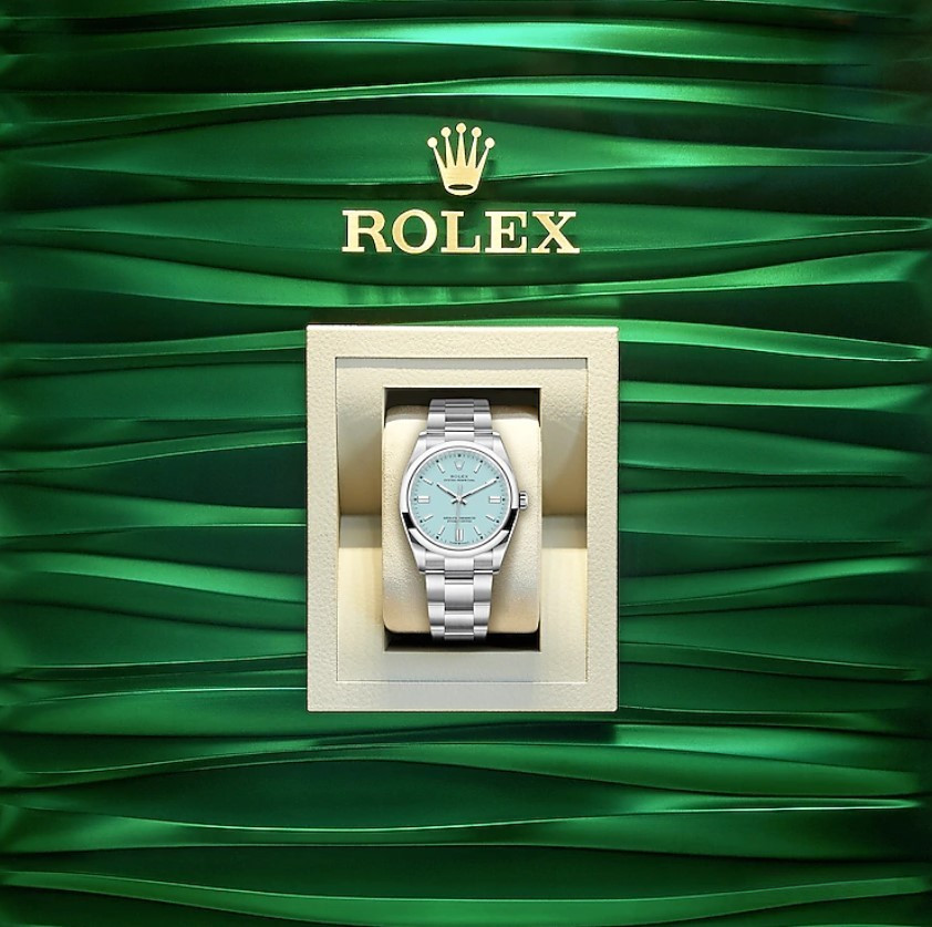 Часы Rolex Oyster Perpetual являются официально сертифицированным хронометром COSC, выпущены в круглом корпусе из нержавеющей стали. Размер составляет 36 мм, водонепроницаемость 100 м. Внутри корпуса установлен автоматический механизм, Калибр 3230, обладающий запасом хода 70 часов. На голубом циферблате отображаются часы, минуты, секунды. Часы комплектуются браслетом из нержавеющей стали.