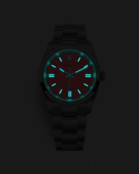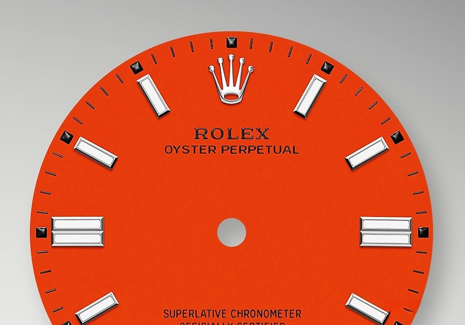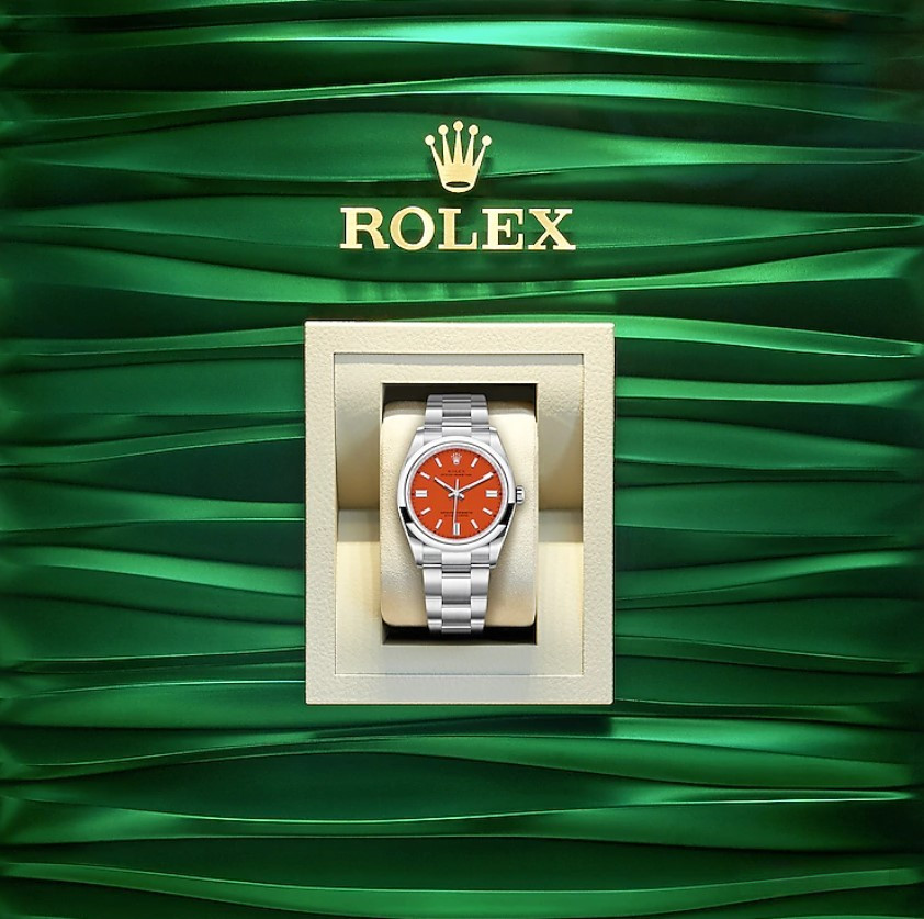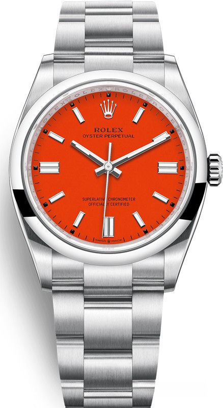 Часы Rolex Oyster Perpetual являются официально сертифицированным хронометром COSC, выпущены в круглом корпусе из нержавеющей стали. Размер составляет 36 мм, водонепроницаемость 100 м. Внутри корпуса установлен автоматический механизм, Калибр 3230, обладающий запасом хода 70 часов. На оранжевом циферблате отображаются часы, минуты, секунды. Часы комплектуются браслетом из нержавеющей стали.