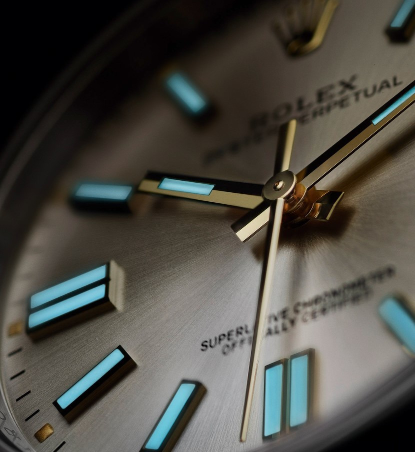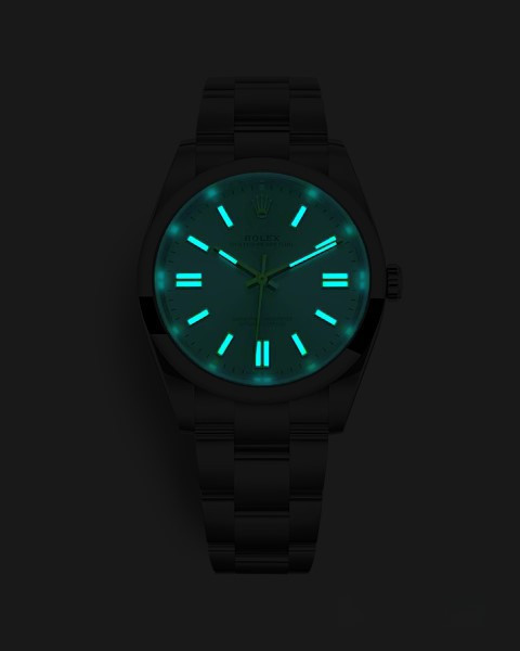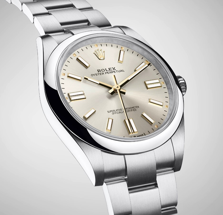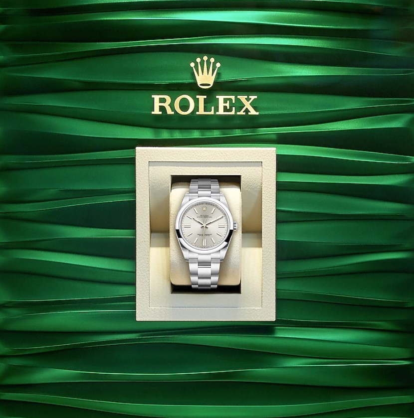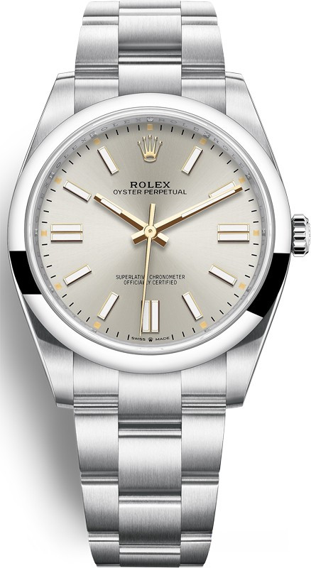 Часы Rolex Oyster Perpetual являются официально сертифицированным хронометром COSC, выпущены в круглом корпусе из нержавеющей стали. Размер составляет 41 мм, водонепроницаемость 100 м. Внутри корпуса установлен автоматический механизм, Калибр 3230, обладающий запасом хода 70 часов. На серебристом циферблате отображаются часы, минуты, секунды. Часы комплектуются браслетом из нержавеющей стали.