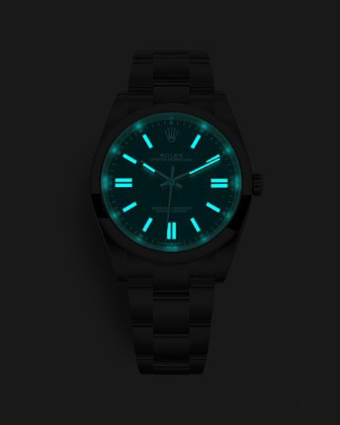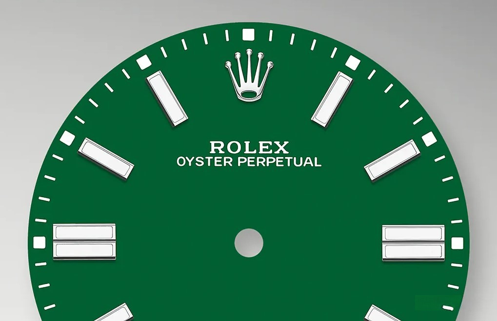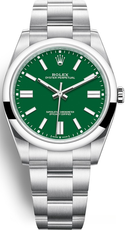 Часы Rolex Oyster Perpetual являются официально сертифицированным хронометром COSC, выпущены в круглом корпусе из нержавеющей стали. Размер составляет 41 мм, водонепроницаемость 100 м. Внутри корпуса установлен автоматический механизм, Калибр 3230, обладающий запасом хода 70 часов. На зеленом циферблате отображаются часы, минуты, секунды. Часы комплектуются браслетом из нержавеющей стали.