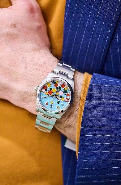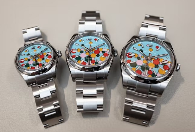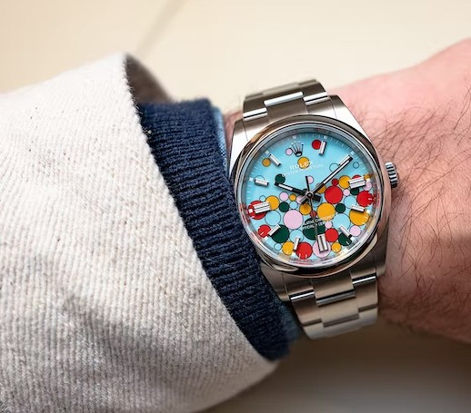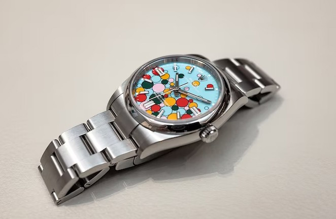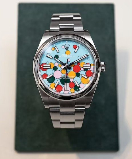 Часы Rolex Oyster Perpetual являются официально сертифицированным хронометром COSC, выпущены в круглом корпусе из нержавеющей стали. Размер составляет 41 мм, водонепроницаемость 100 м. Внутри корпуса установлен автоматический механизм, Калибр 3230, обладающий запасом хода 70 часов. На голубом циферблате отображаются часы, минуты, секунды. Часы комплектуются браслетом из нержавеющей стали.