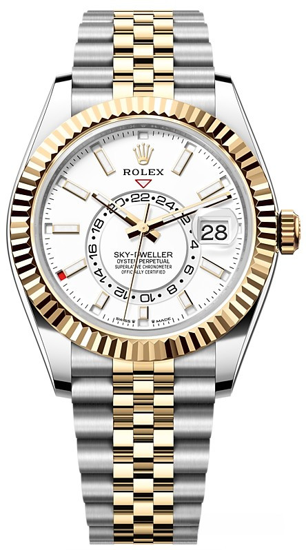 Часы Rolex Sky-Dweller 42mm Steel and Yellow Gold представлены в корпусе размером 42 мм из нержавеющей стали и желтого золота 18к водонепроницаемостью 100 метров. Внутри корпуса установлен автоматический механизм, Калибр 9002, обладающий запасом хода 72 часа. На белом циферблате отображаются часы, минуты, секунды, дата. Часы поставляются на браслете из нержавеющей стали и желтого золота 18к. Годовой календарь.