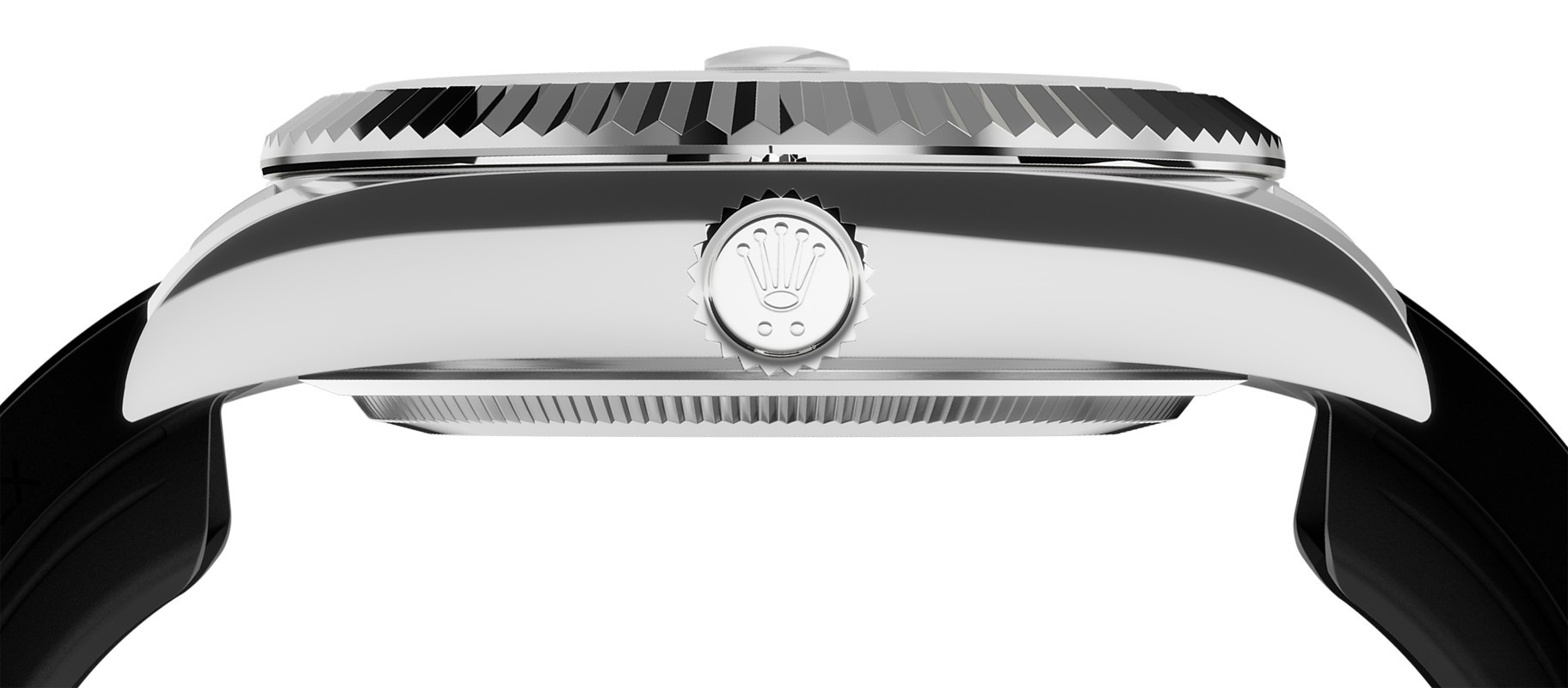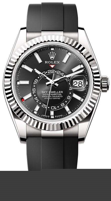 Часы Rolex Sky-Dweller являются официально сертифицированным хронометром COSC, выпущены в круглом корпусе из белого золота 18к. Размер составляет 42 мм, водонепроницаемость 100 м. Внутри корпуса установлен автоматический механизм, Калибр 9002, обладающий запасом хода 72 часа. На черном циферблате отображаются часы, минуты, секунды, дата, месяц. Годовой календарь. Вращающийся безель. Часы комплектуются каучуковым ремешком с золотой затежкой.